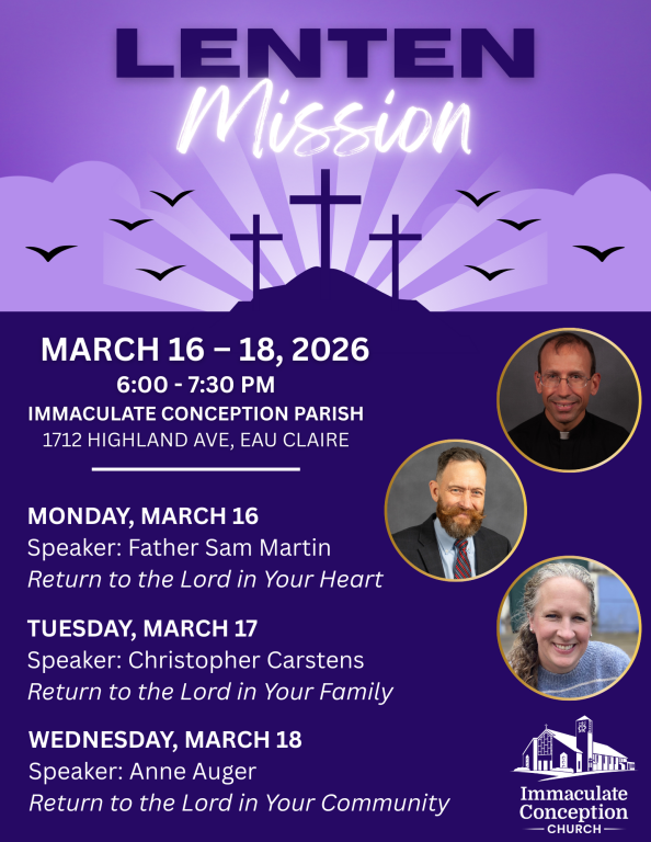 A series of three evenings, our Lenten Mission will be held Monday, March 16, Tuesday, March 17, and Wednesday, March 18. Each evening session will be held from 6:00-7:30pm. A social gathering with light refreshments will follow each session in Father Klink Hall. The entire event is free to attend, registration is encouraged. We will be welcoming three amazing speakers to speak on our topic: Return to the Lord.