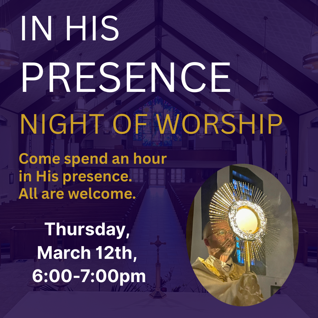 Join us for an evening Holy Hour of Adoration, including praise and worship music, scripture reflection, and a procession of the Eucharist.